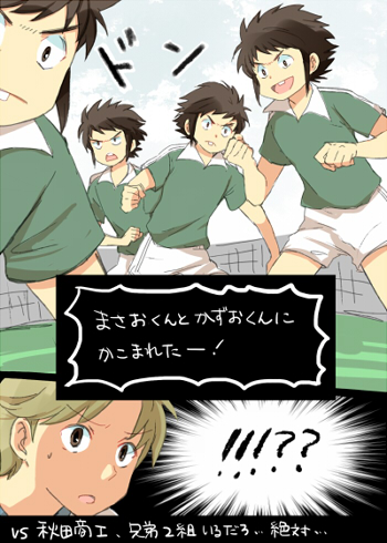 南葛高校はボールをキープした直後に、どこからともなく飛んでくる兄弟に奪われ、取り返そうとするとジェミニであっさり抜かれます。